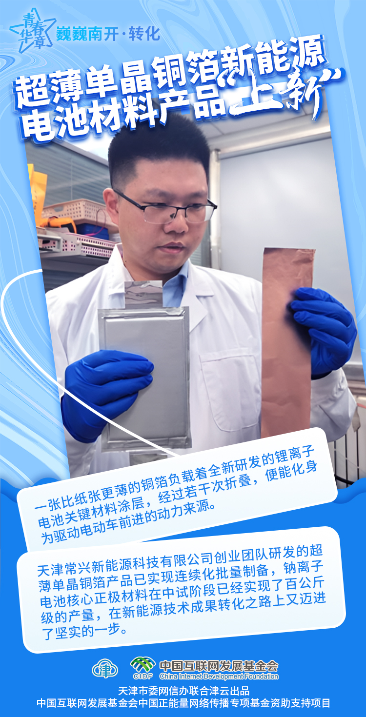 一张比纸张更薄的铜箔负载着全新研发的锂离子电池关键材料涂层,经过若干次折叠,便能化身为驱动电动车前进的动力来源。最近,天开园企业——天津常兴新能源科技有限公司又传来了好消息:该创业团队研发的超薄单晶铜箔产品已实现连续化批量制备,钠离子电池核心正极材料在中试阶段已经实现了百公斤级的产量,在新能源技术成果转化之路上又迈进了坚实的一步。